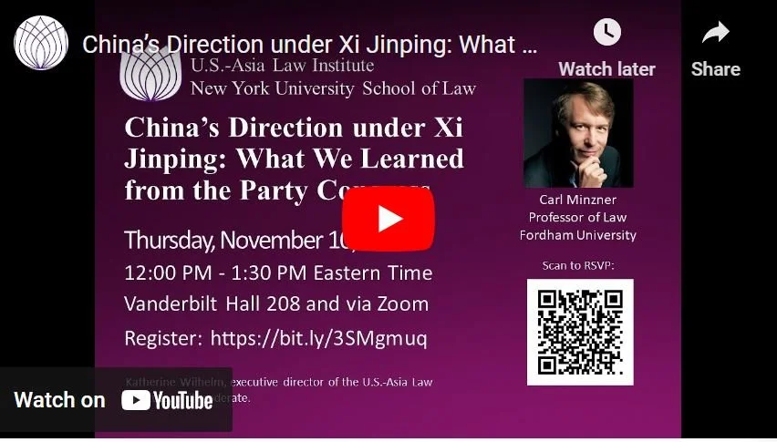 China is steadily sliding into an era of highly centralized one-man rule. The recently concluded 20th National Congress of the Chinese Communist Party not only confirmed Xi Jinping as China's top leader for a third term, but packed the party’s senior ranks with his own close associates while sweeping out anyone not affiliated with him. Fordham Law Professor Carl Minzner will share his analysis of what we can expect for the next decade (or more) of Xi Jinping rule, based on the speeches and documents from the party congress and other recent messaging. He also will discuss what all this could mean for foreign scholars trying to conduct research in China and engage with peers there.