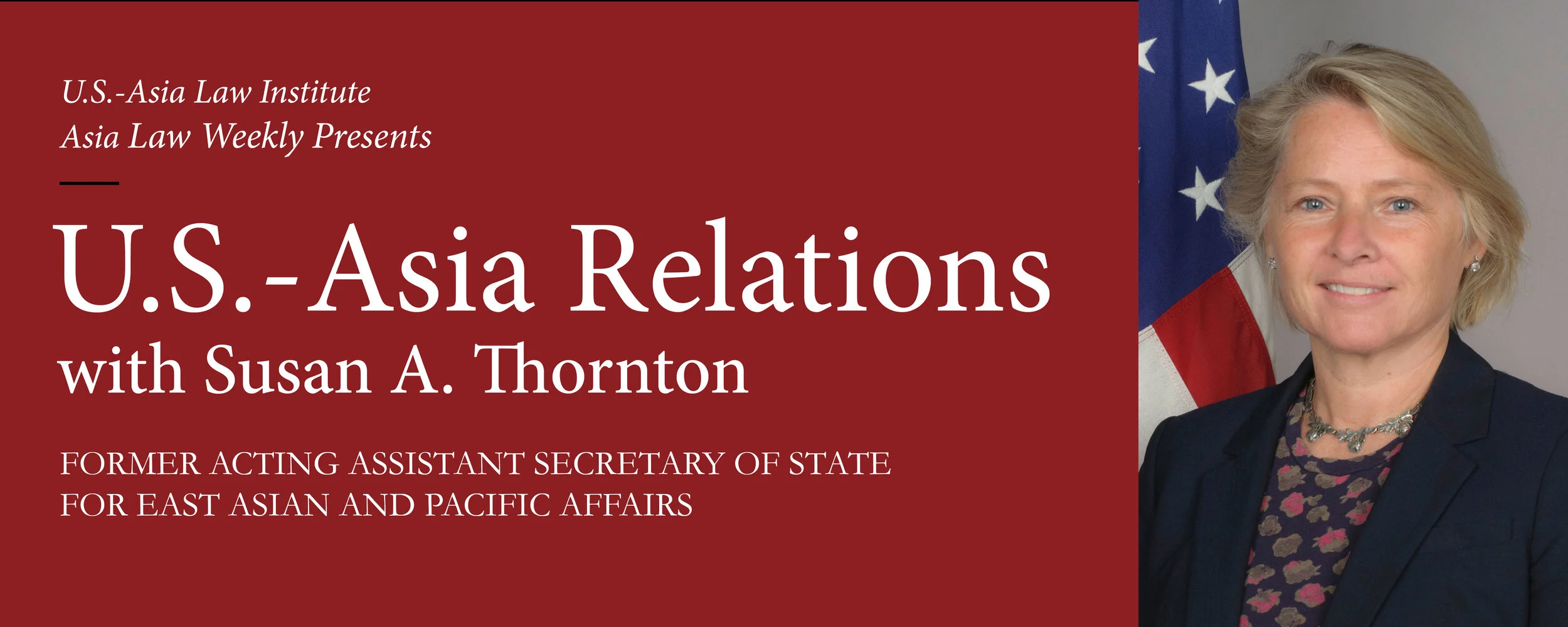 Join the U.S.-Asia Law Institute for a special luncheon dialogue with guest Susan A. Thornton, former acting Assistant Secretary of State for East Asian and Pacific Affairs. This dialogue will explore Thornton's life and diplomatic career, which focused primarily on East and Central Asia. In leadership roles in Washington, Thornton worked on China and Korea policy, including stabilizing relations with Taiwan, the U.S.-China Cyber Agreement, the Paris Climate Accord and led a successful negotiation in Pyongyang for monitoring of the Agreed Framework on denuclearization. In 2019, a year after her retirement from the State Department, she co-authored The Washington Post Article, "China is Not an Enemy," with Ezra Vogel, Taylor Fravel, Stapleton Roy, and Michael D. Swaine.