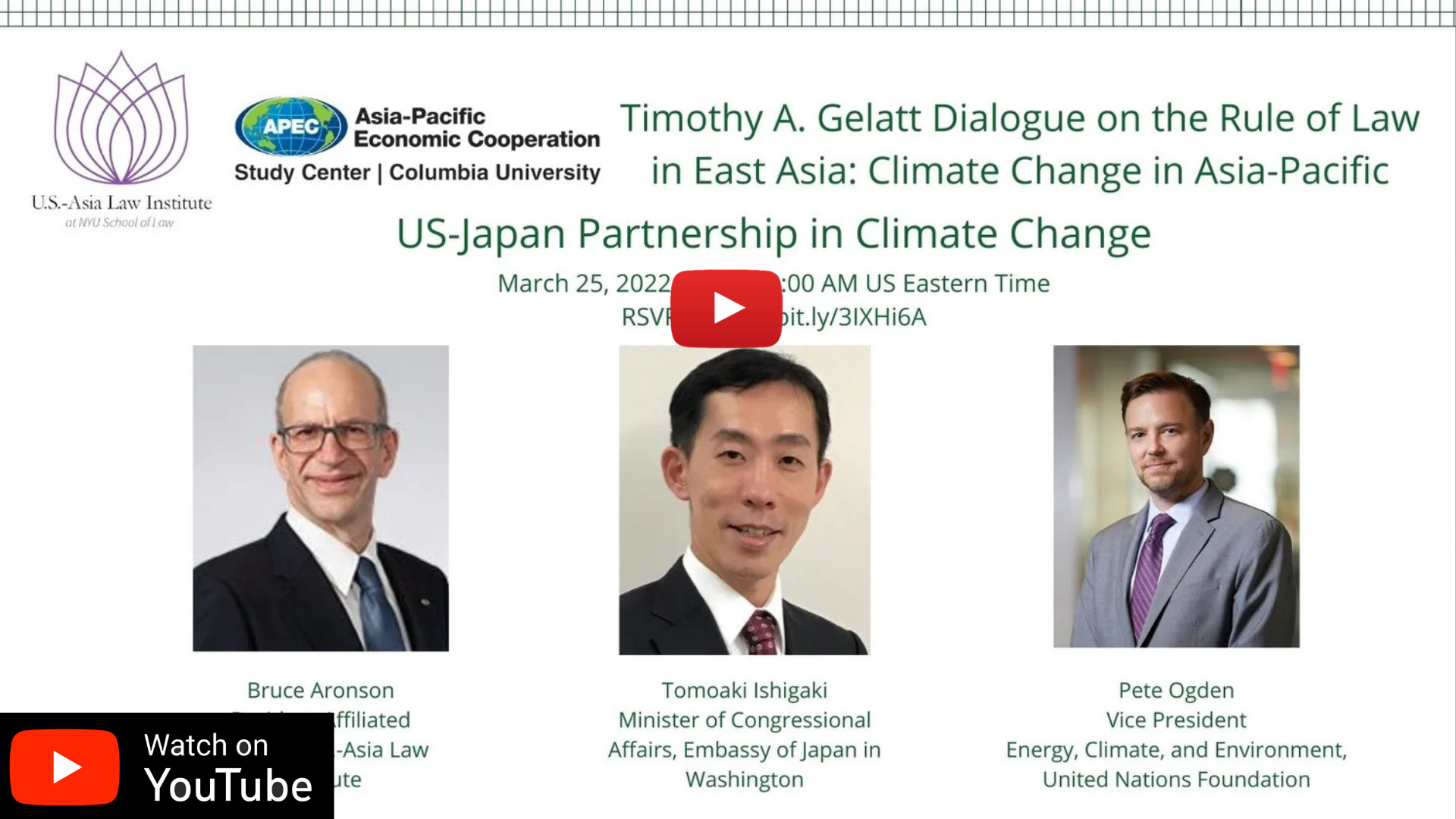 Tomoaki Ishigaki, minister of congressional affairs at the Embassy of Japan to the United States, and Pete Ogden, vice president for energy, climate, and the environment at the United Nations Foundation, spoke about the roles played by the US and Japan in climate negotiations, the interplay between domestic constraints and international action, and areas for closer cooperation to address the accelerating climate crisis. Bruce Aronson, a U.S.-Asia Law Institute affiliated scholar, moderated the discussion.