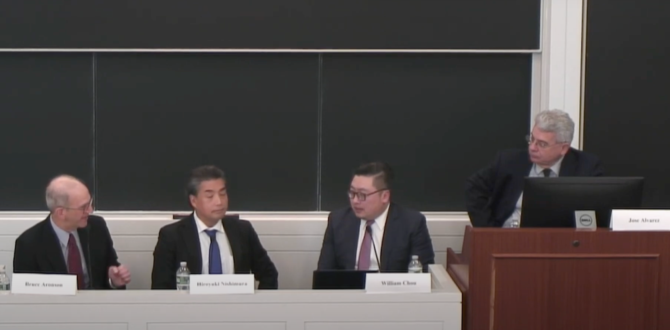 (L-R) Bruce Aronson, Hiroyuki Nishimura, William Chou, and Jose Alvarez discussing Nippon Steel, U.S. Steel, and the implications for US-Japan Relations